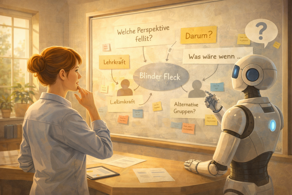 Diese Rolle fügt sich in das KI-Teammodell ein, das dieser Artikelreihe zugrunde liegt. Der Stratege – die Lehrkraft – gibt die Richtung vor. Die KI übernimmt eine klar begrenzte Funktion: Sie stellt Fragen, zeigt Muster, öffnet Blickwinkel. Sie agiert nicht autonom und ersetzt keine pädagogische Urteilsfähigkeit.